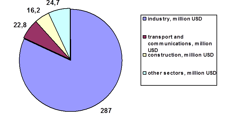 Also in 2011, investors' funds were sent to the transport and communications (22,8 million USD, 6,5%), construction (16,2 million USD, 4,7%) trade (14,1 million USD, 4%), other sectors (10,6 million USD, 3%).